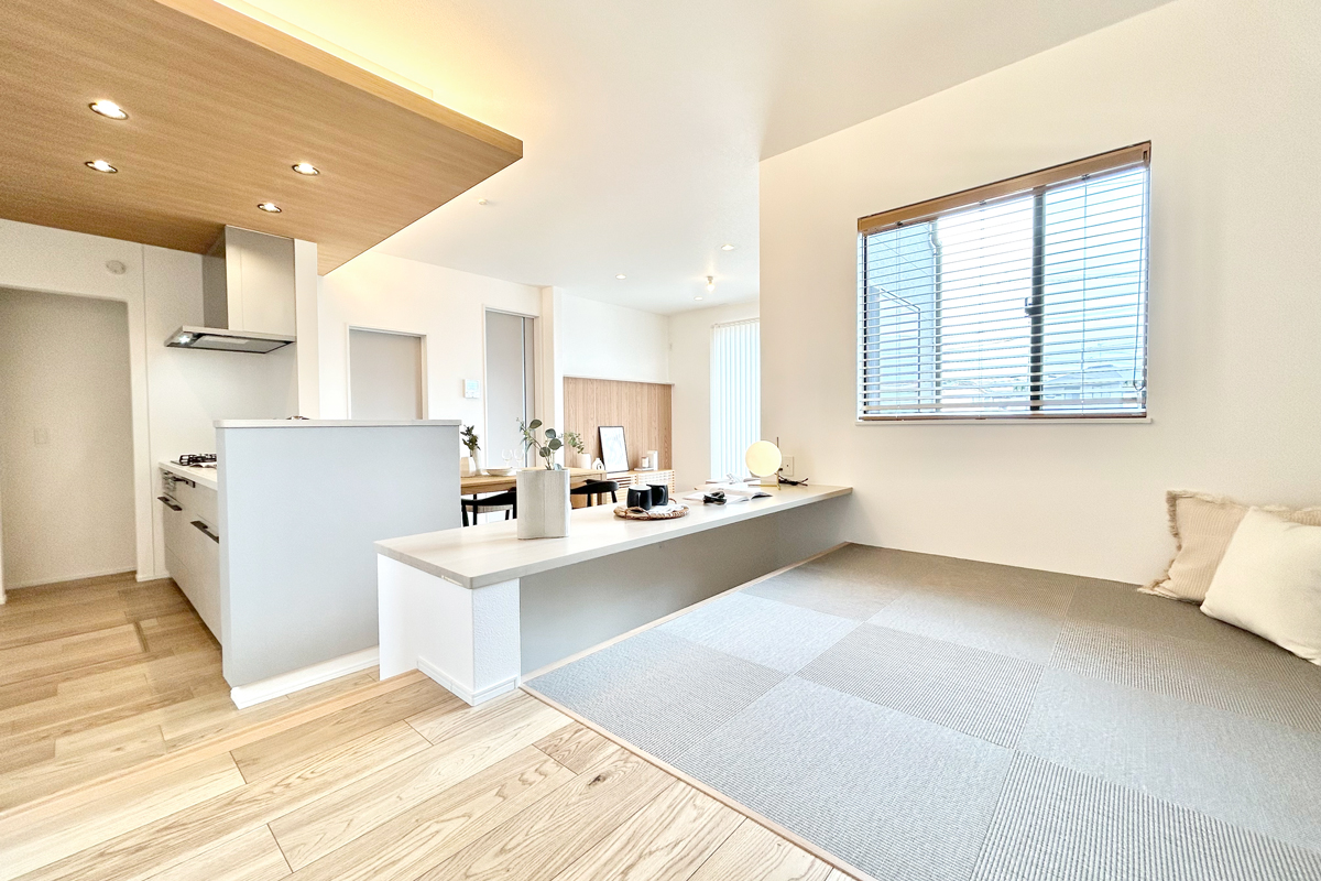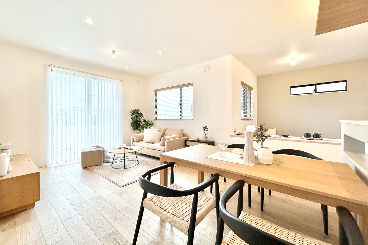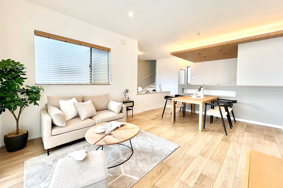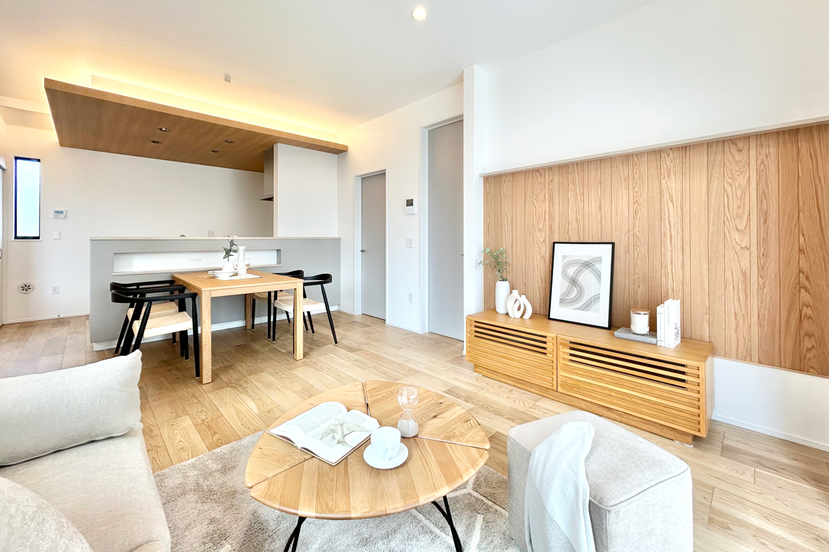 - 【心安らぐ時間を紡ぐリビング空間】 温かみのある色合いと上質な素材が調和し、洗練された雰囲気を醸し出すリビング。家族の団らんをより心地よい時間へと導きます。※1号棟/2026年3月撮影