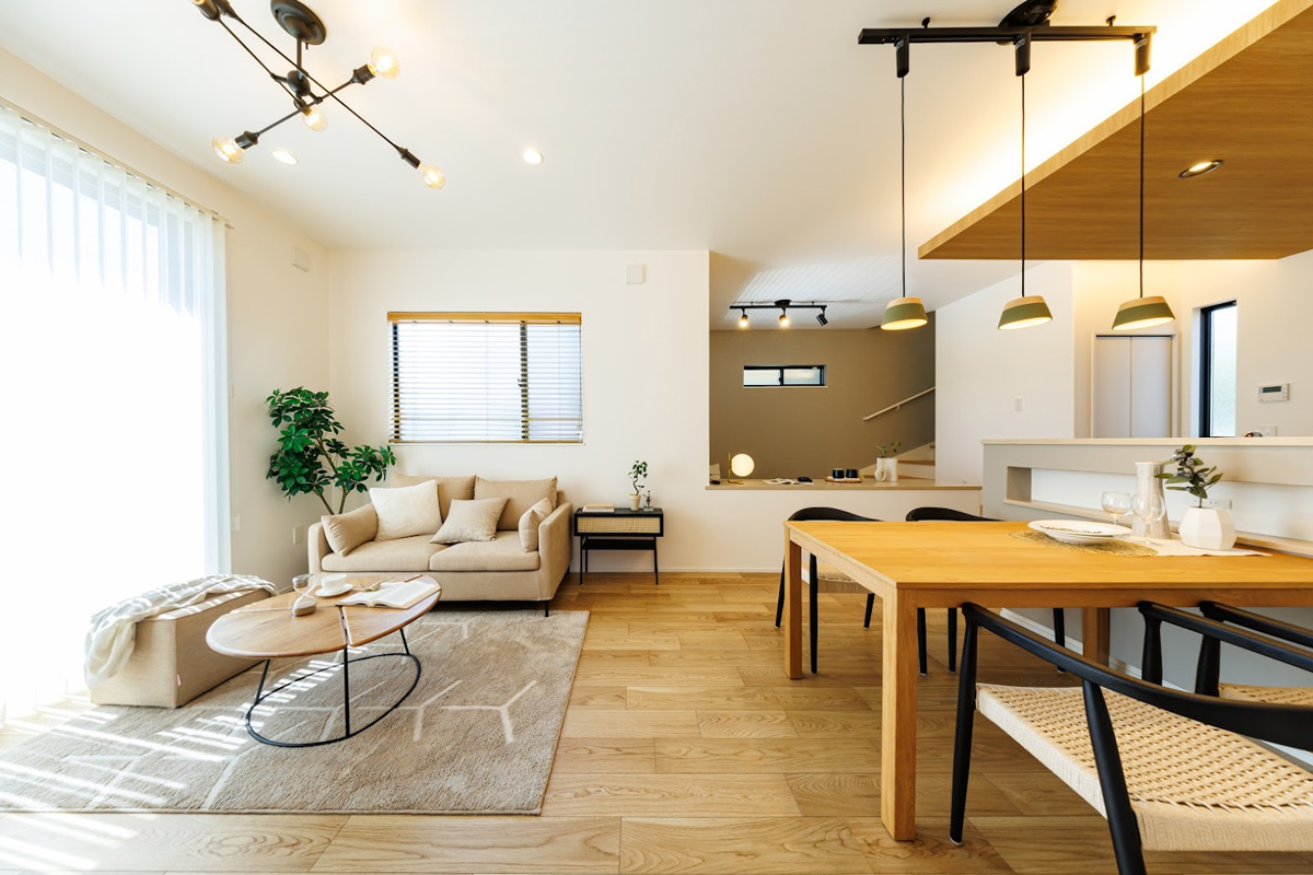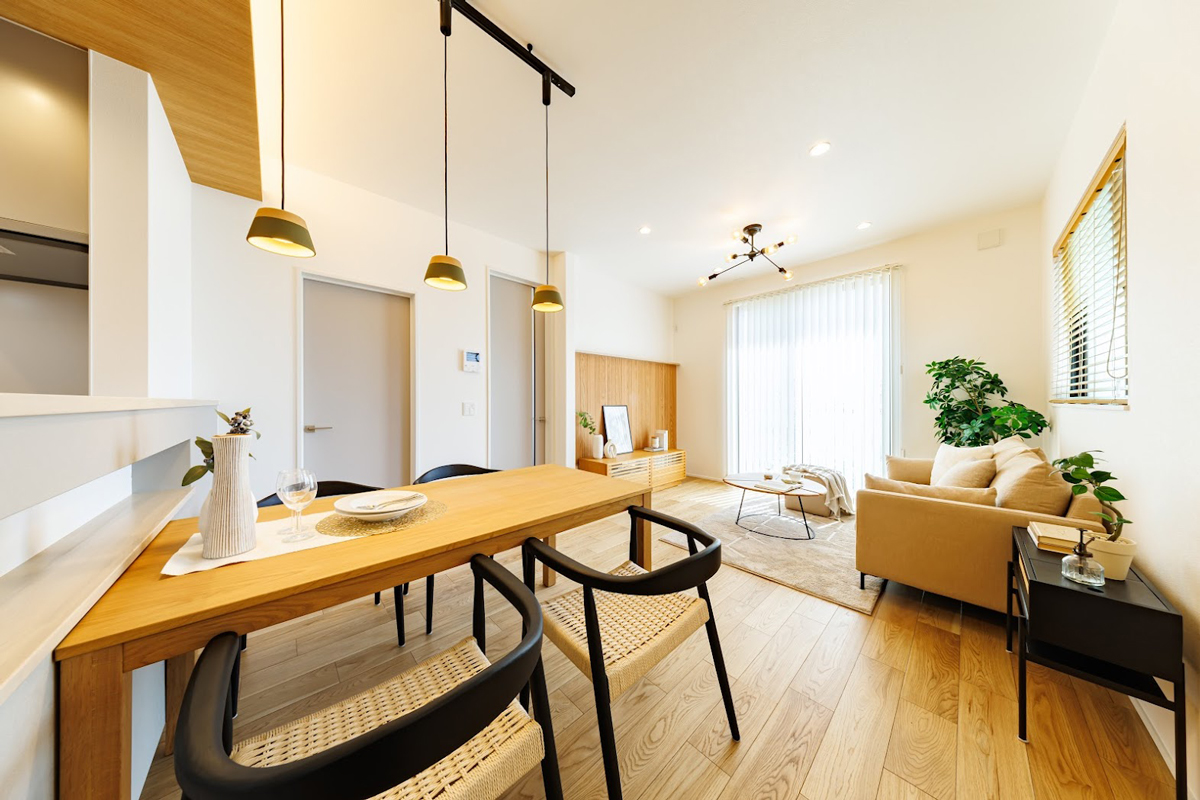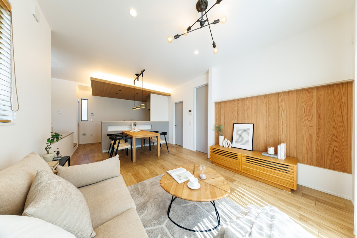 - 【個性を引き立てるアクセントパネル】 リビングの一部に上質なデザインのアクセントパネルを設置。素材感豊かな意匠が、空間に華やかさと洗練された印象を与えます。※1号棟/2026年4月撮影