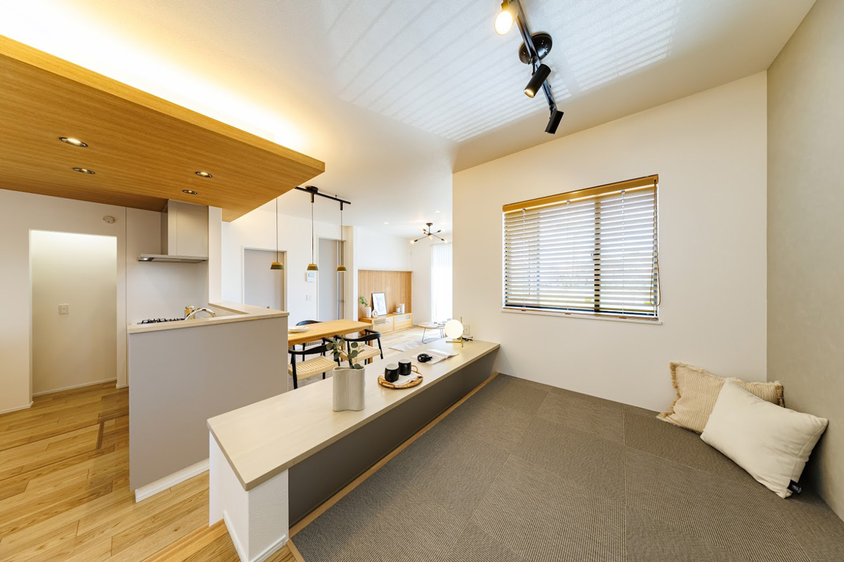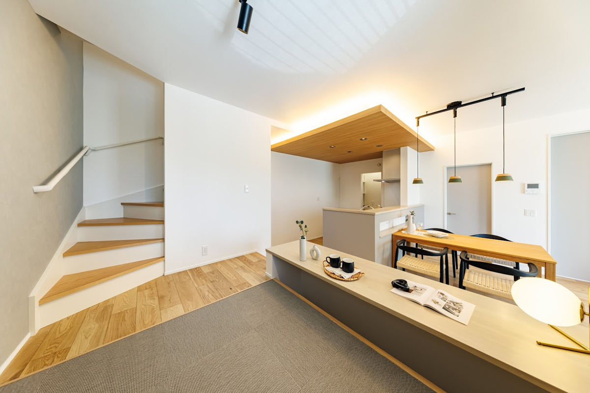 - 【段差をつけたステアリビング】 階段の踊り場を利用したテキスタイル敷きの小上がり空間。家族の気配を感じつつ、趣味やリビング学習に集中できる場として活躍します。※1号棟/2026年4月撮影