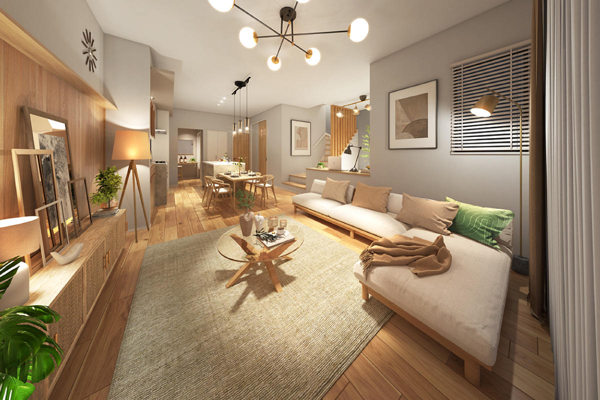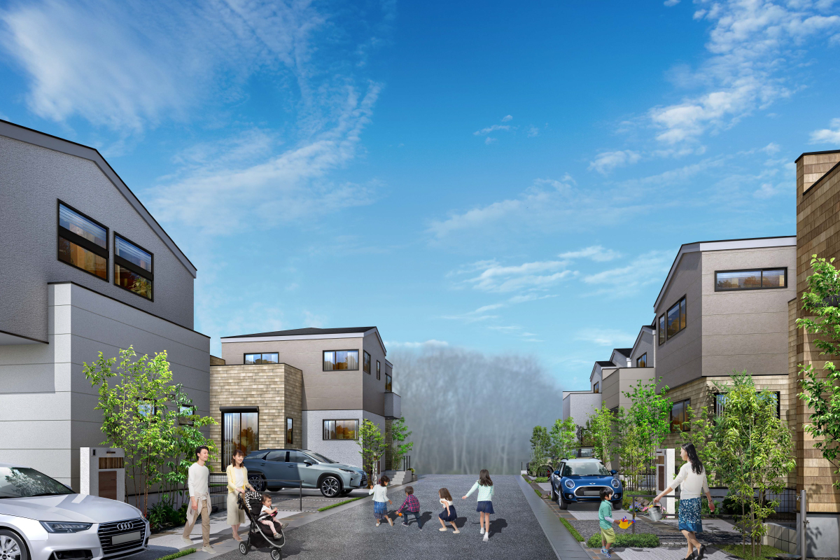 - 木調の外壁材を中心に、やわらかトーンで纏めた街並み。国産木材を活用した外壁材は。家づくりが森づくりに繋がっていくエコ素材。さらに、緑と陽だまりが連なる外構や、住人の交流も育む街区道路などにより、ゆったり憩いを味わうような穏やかな杜の街を描きました。
