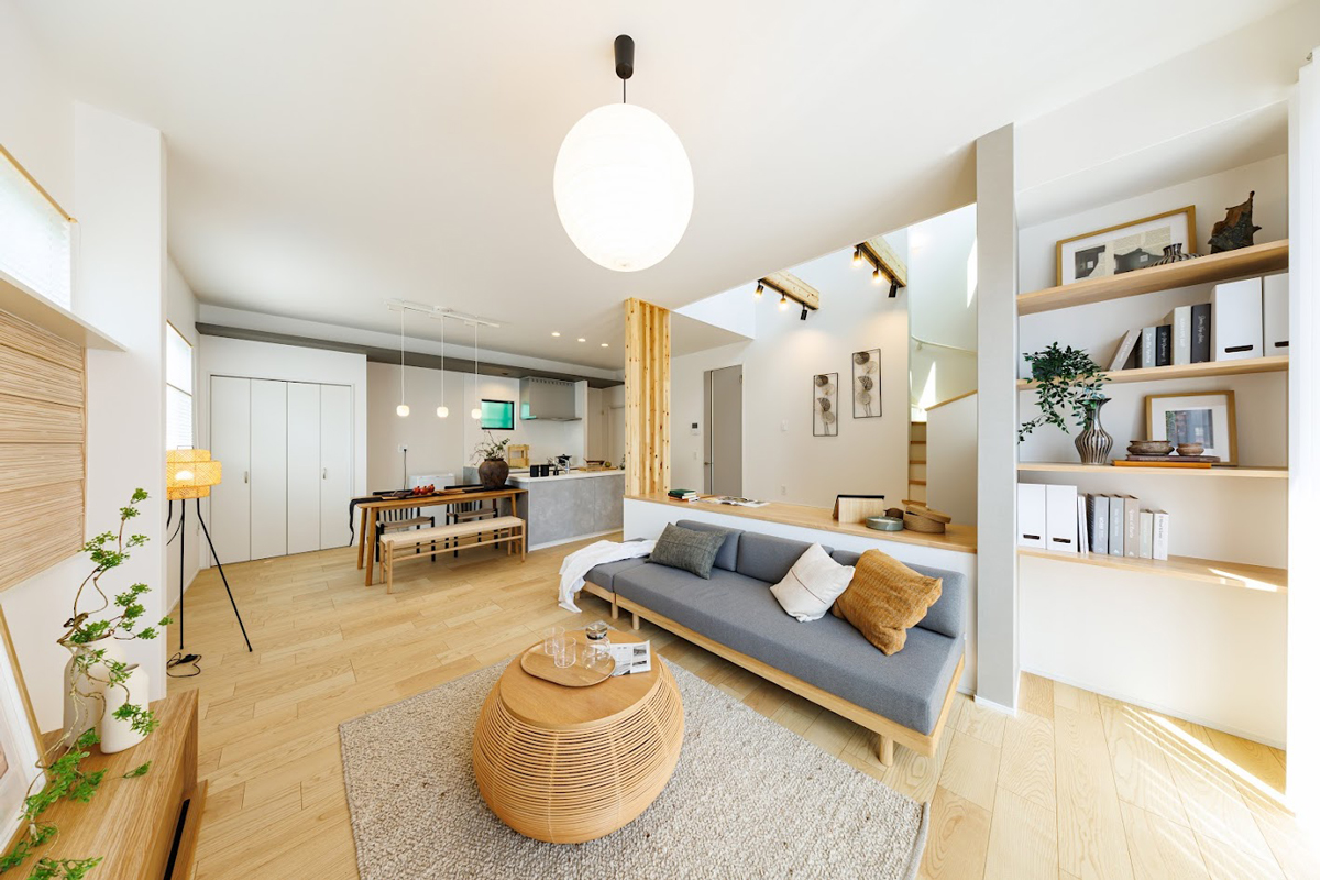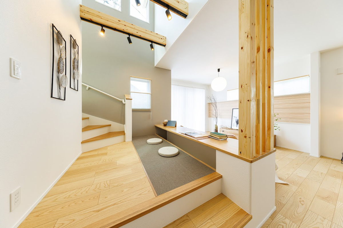 - LDKから2段上がった吹抜けのステアリビングを設置。テレワークやリビング学習など、子どもから大人まで家族と程よい距離感で思い思いに過ごせます。※6号棟/2026年4月撮影(分譲済)