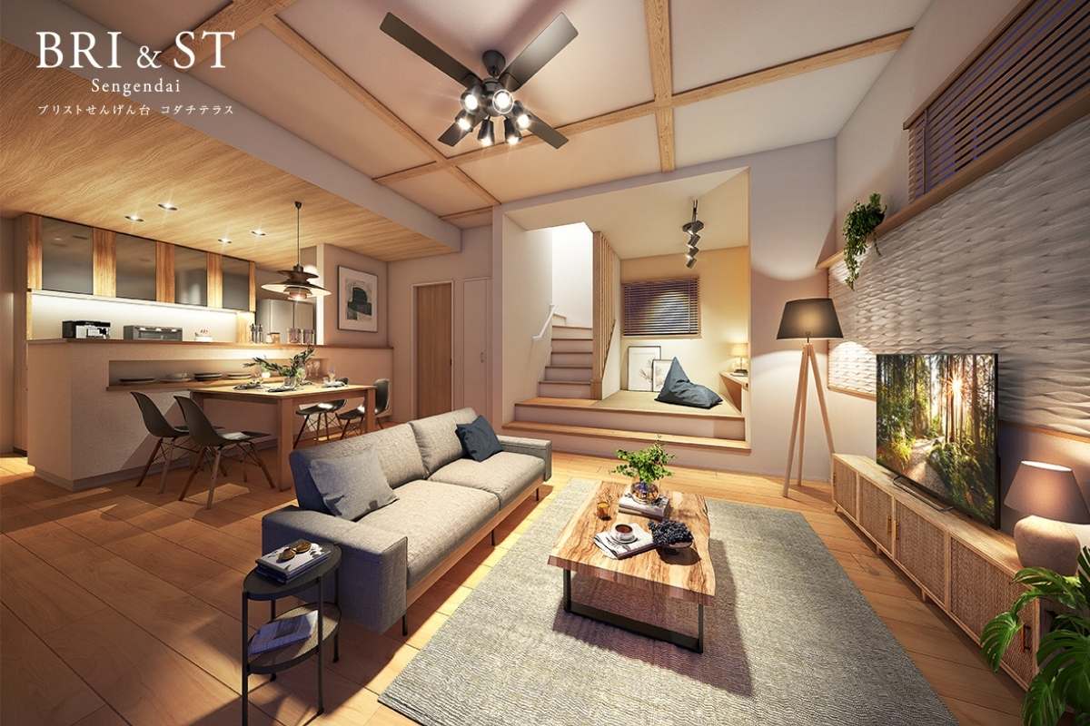 - 木を温もりを楽しむインテリア。 地域や街並みの豊かな緑と呼応するように、 住まいの内にも木の風合いが心地よいインテリアを豊富に採用。 自然のぬくもりに包まれるような、心地よい住空間を描きました。