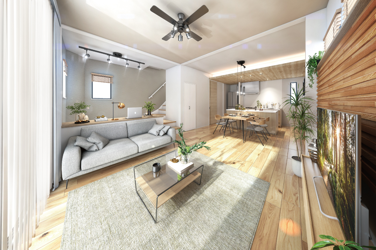 - 木の素材感を活かしたインテリアが、空間にあたたかみと落ち着きを演出。自然光との調和を意識した設計により、日常のひとときを上質に包み込む住まいを実現しました。※1号棟完成予想図