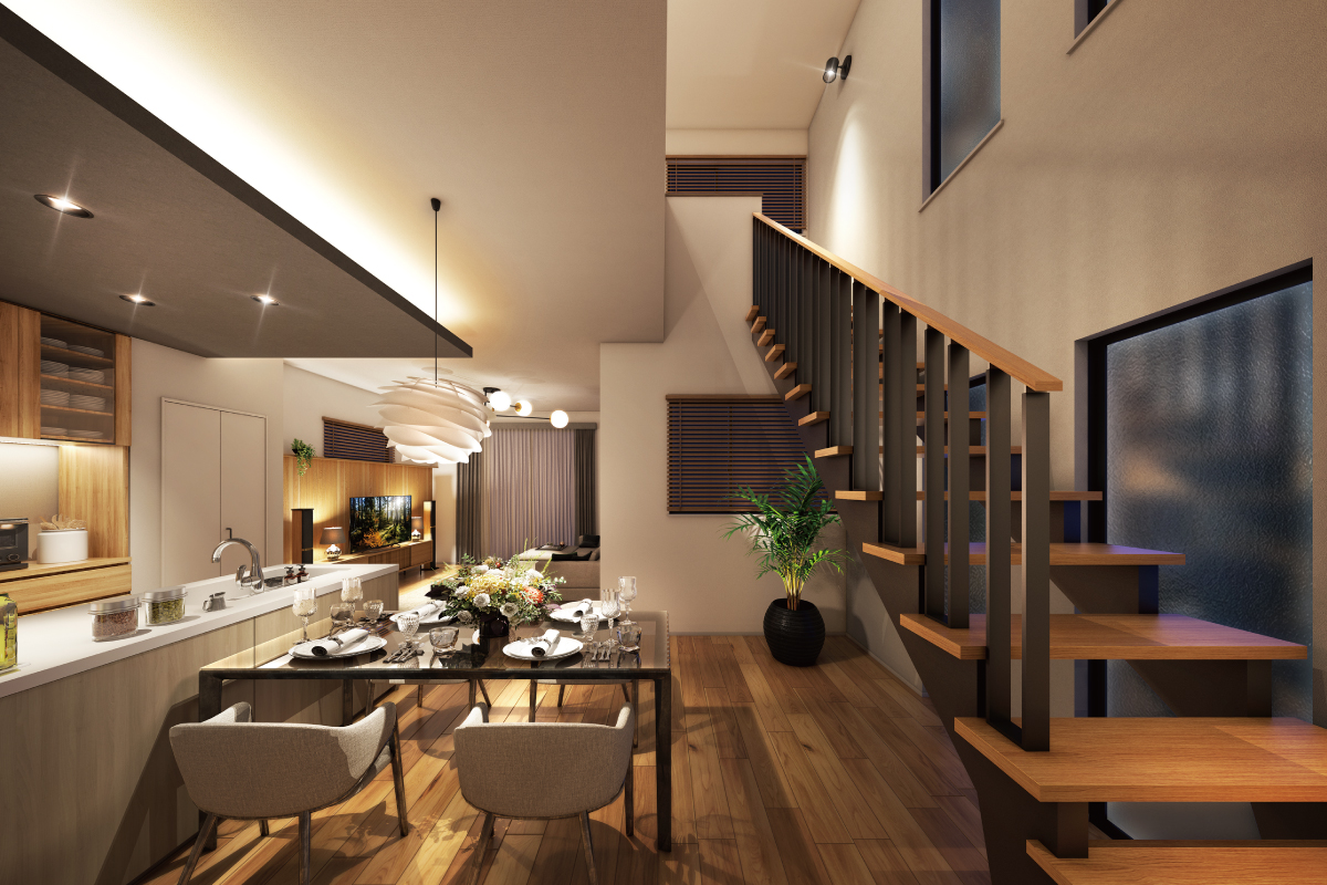- 腰掛けるのにちょうど良い高さの小上がり空間「ファミリーラウンジ」を取り入れた住まい。堀机で脚を伸ばしながらリビング学習など自由に過ごせます。※2号棟完成予想図
