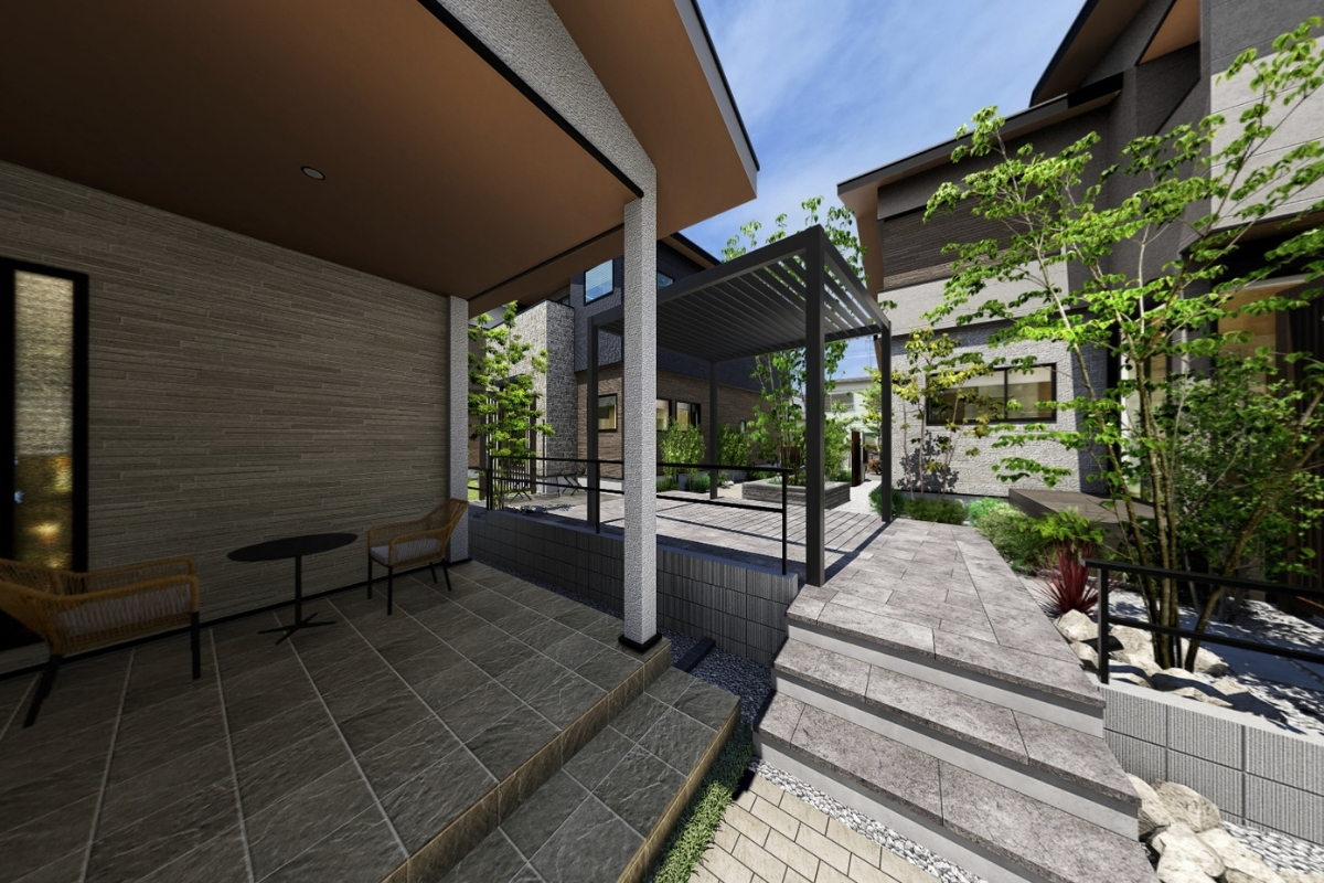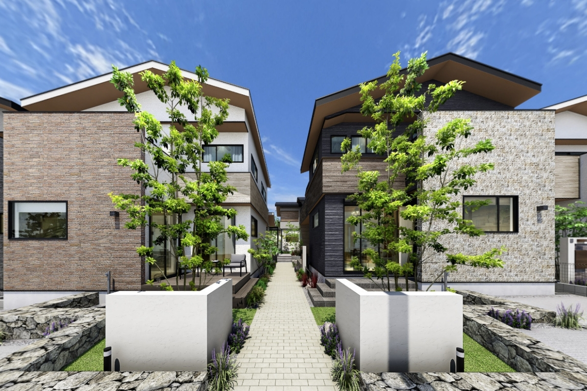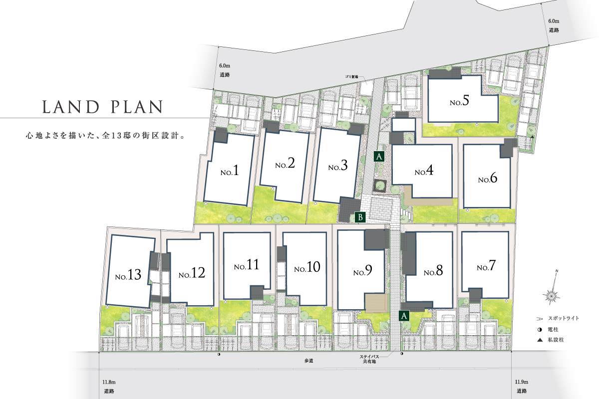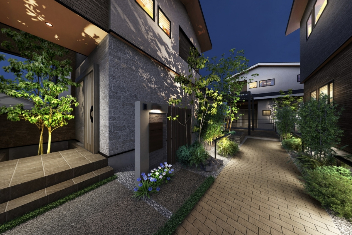- ゆとりをもって配置された全13邸の街区には、インターロッキング舗装や四季折々の植栽、エクステリア、照明計画を採用し、美しい景観を創出。さらに、景観に配慮されたコミュニティを育む設えを多数採用し、街の一体感を生み出しました。街全体をひとつの風景として、日々の暮らしを豊かさで包み込む街並みを描き出しています。