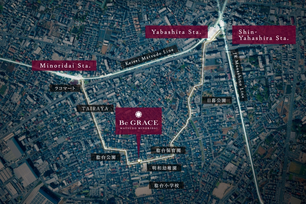 - 「みのり台」駅徒歩9分をはじめ、3駅2路線が利用可能。小学校へ徒歩3分、幼稚園徒歩1分のほか、商業施設や公園も徒歩圏内に集まり、利便性と心地よさをあわせ持つ住環境が広がっています。 ※航空写真は「国土地理院ウェブサイト」出典のもの(2024年4月撮影)に一部CG加工を施したもので実際とは異なります。