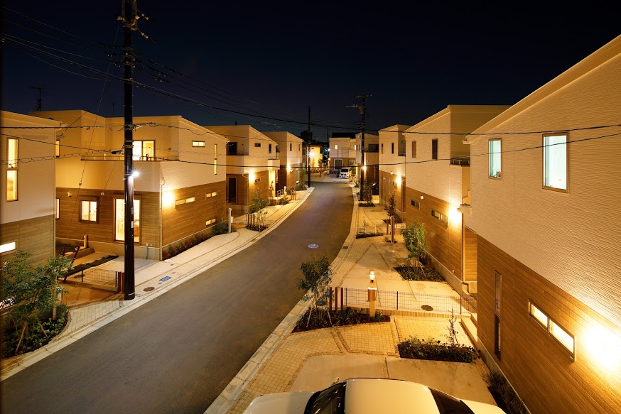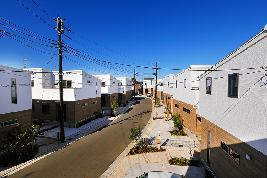 ゆるやかな曲線の先に見え隠れするツートンカラーの“木箱”の街「カフェマチ鶴瀬 ココチ箱」。 森の小道を思わせる道路。その先に見えるのは、まぶしい白と木のやさしい色合いで彩られた街並みです。 ゆったりとカーブを描く街路に沿って並ぶ住まいは、まるで“かわいい木箱”のよう。 一邸ごとにゆとりある空間は、そこに暮らす方々のライフスタイルを感じさせます。