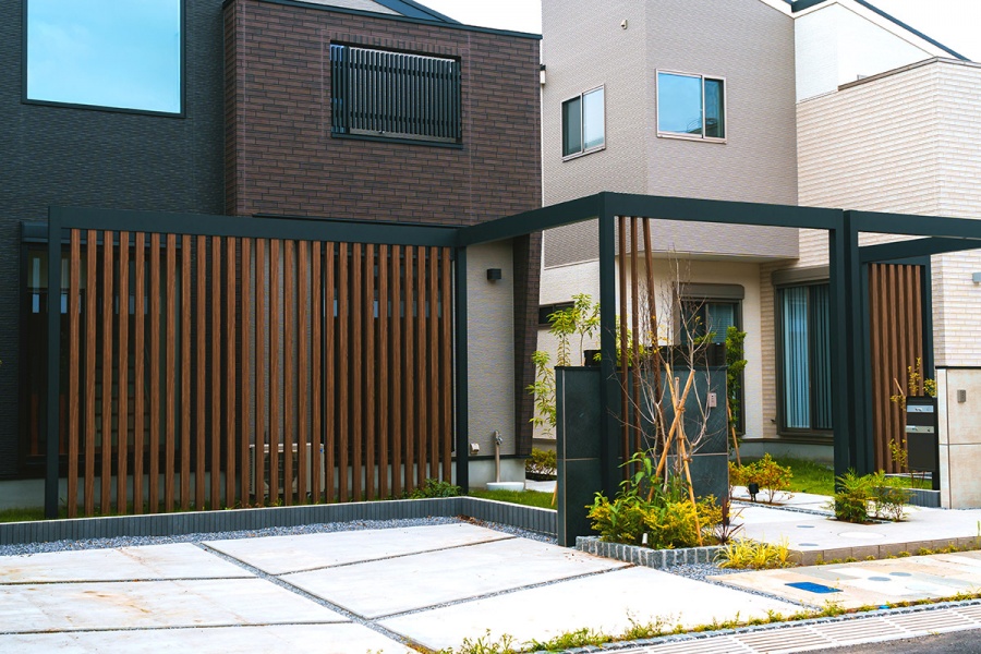 モノトーンの色合いが際立つファサードデザイン。石と木の素材感が心を癒す表情を描いています。