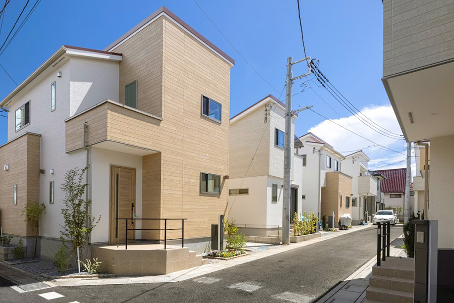 ホワイトを基調としたファサードにリズミカルに配された窓や木目模様のアクセントがデザイン性を高めながら、自然豊かな植栽たちが瑞々しい彩りを添えています。