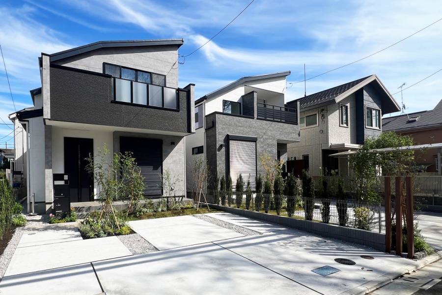 全邸130㎡以上のゆとりと開放感を携えた、落ち着きのあるグレーベースの邸宅。植栽や近隣の緑の華やかさとのコントラストが美しい住まう家族に相応しい寛ぎの街並みを描きました。