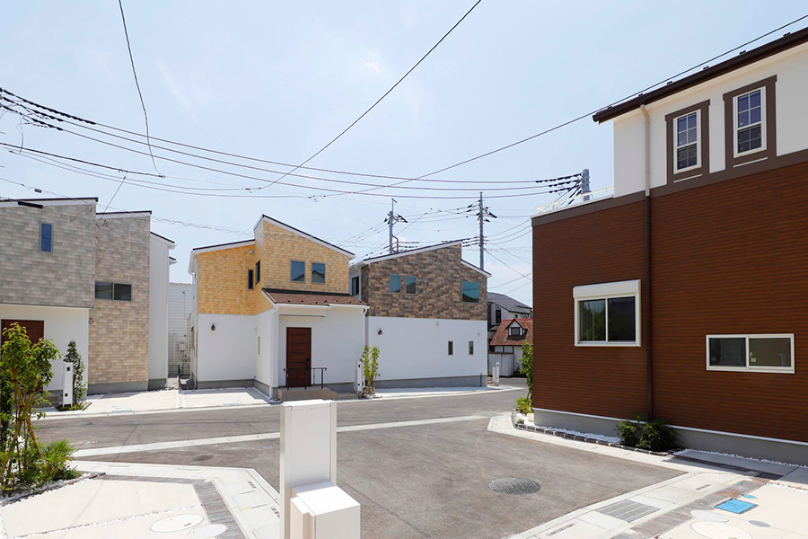 優しい風景と植栽に調和するような、シンプルなフォルムに、温もり感じる木目調の「北欧風デザイン」の街並み。