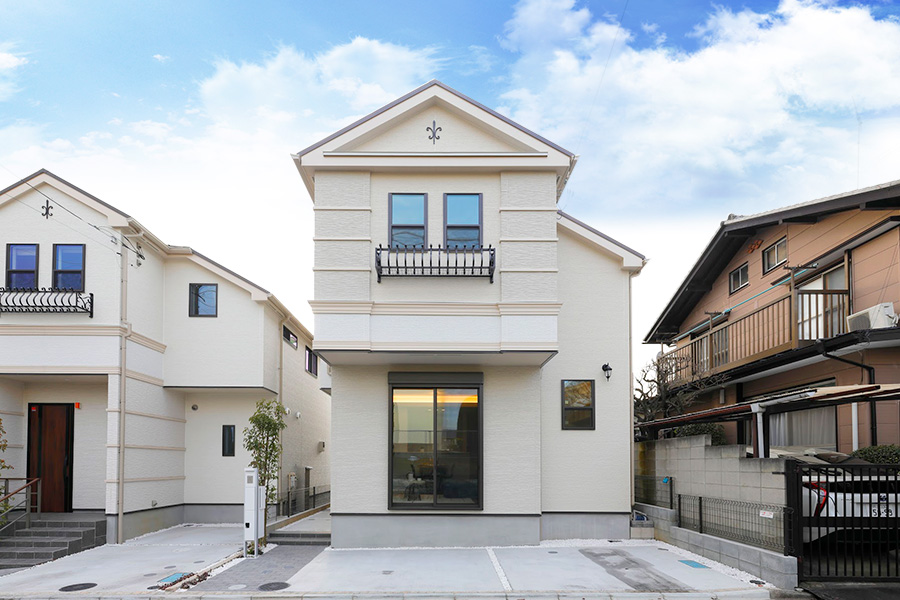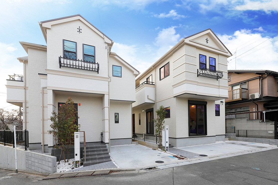 切妻屋根が青空にシャープで幾何学的なスカイラインを描く2邸。邸宅感のあるシルエットが細部のデザインを引き締め、品格を漂わせています。