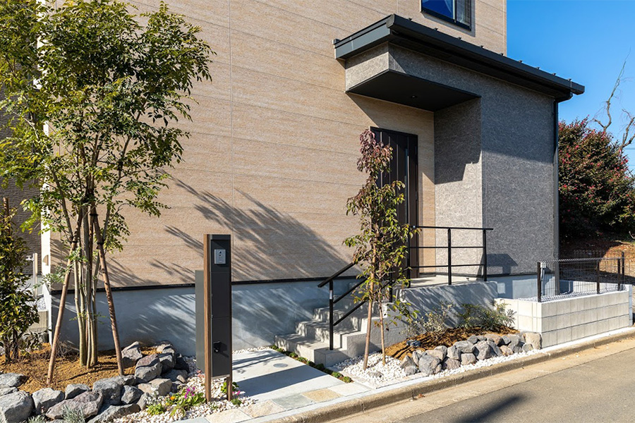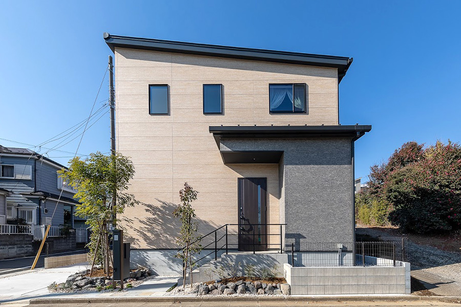 自然な絶妙なニュアンスで彩る、重厚な邸宅の美観。ソリッドなスクエアフォルムが確かな存在感を醸し出す情景。邸宅の外壁にはクールで素材感あるサイディングをバランス良く採用し自然なニュアンスが薫るスタイリッシュな佇まい。