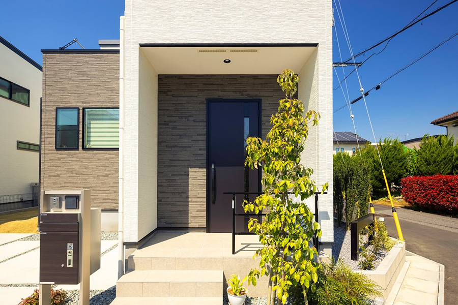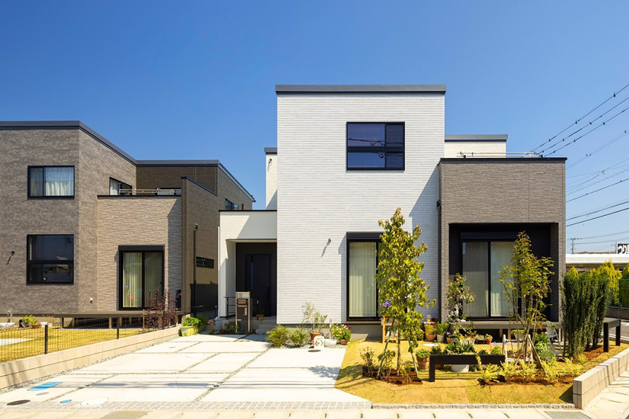 太陽の光が似合うホワイトの外壁をベースに、質感の異なるマテリアルでアクセントをつけた外観デザイン。直線的なラインで構成した建物のシルエットと緑の植栽が融け合い、やすらぎと品格の表情を描き出します。