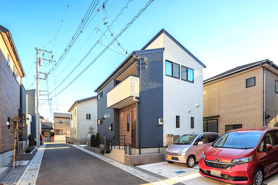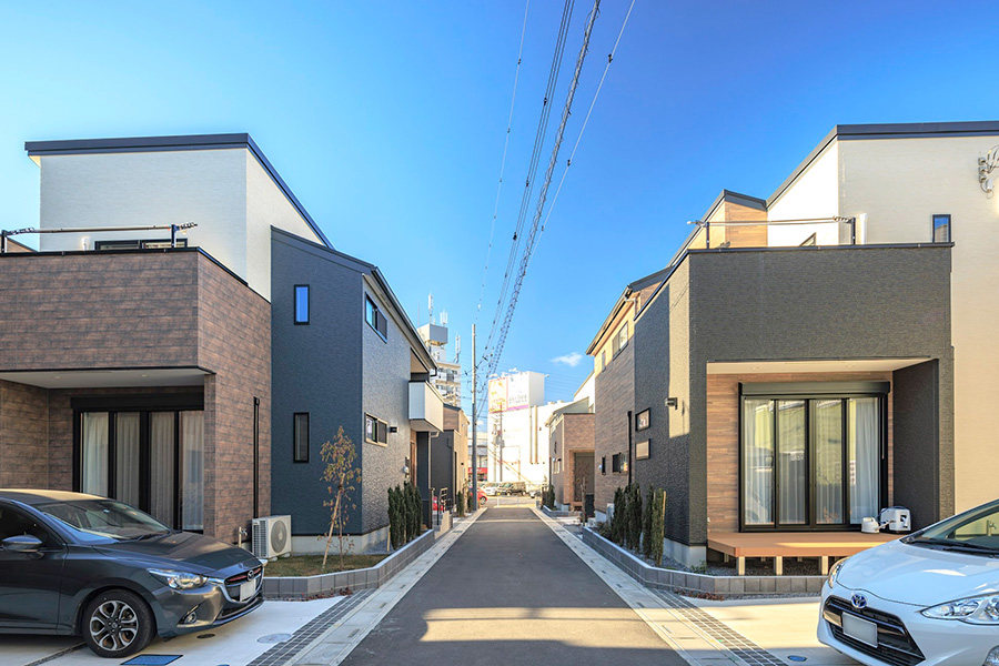 全邸122㎡のゆとりある敷地。2台分のカースペース+デッキから広がる開放感と明るさに恵まれた街。