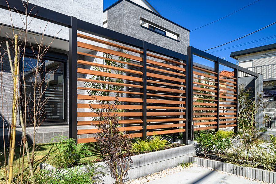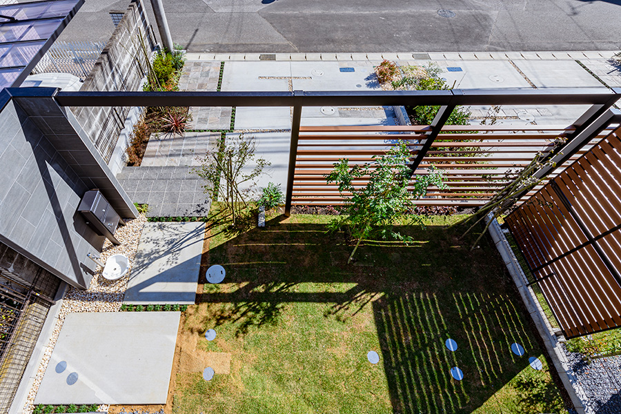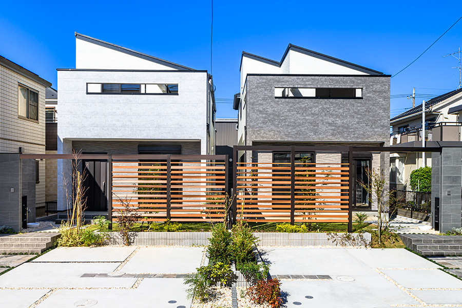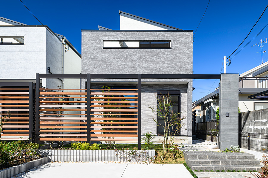 やわらかな色合いとモダンなフォルムで描かれるファサード。石目調の門柱と木調のフレームによるゲートで外とゆるやかに隔てられたアウトドアのプライベート空間。心地よい憩いを我が家時間に採り入れられる、自然味豊かな住まいを描きました。