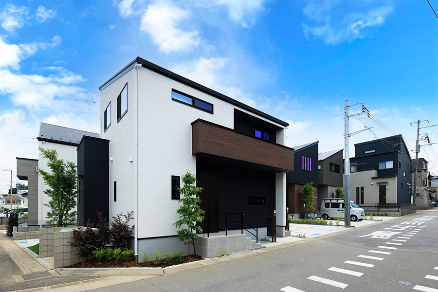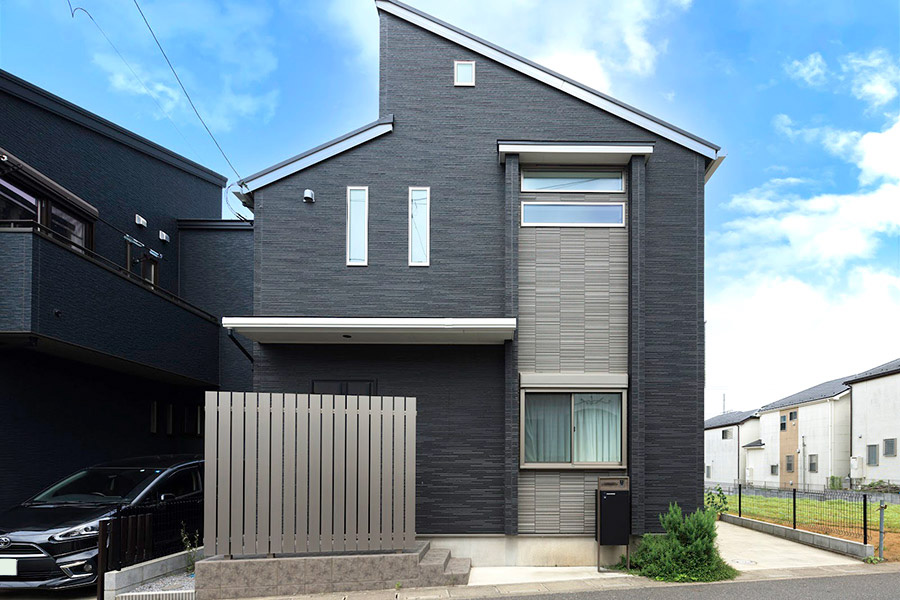 深い色合いを大胆に配しつつ、木調のアクセントサイディングで自然の味わいを醸し出したモダンなカラーリング。
