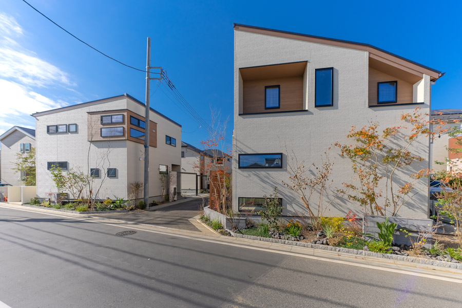 豊かな緑を借景にひろがる全5邸の街並みは、自然素材の質感を効果的に採り入れた、素朴かつ重厚な佇まいに。広い空、そして草木の潤いと融けあいながら、家族の麗しの日々を紡いでいきます。