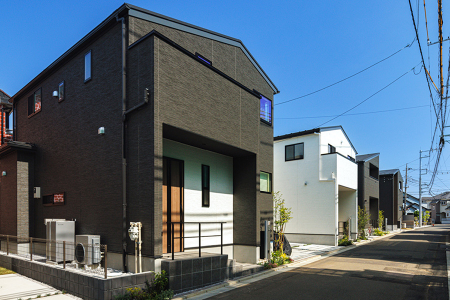 モノトーンの鮮明なコントラスト。多彩なルーフスタイルが生み出す動き。さらに木目調のアクセントサイディングによる味わいや、植栽の緑の潤い、ふりそそぐ陽光のあたたかさなど、自然の豊かさがスタイリッシュな情景のアクセントとなり、上質な街並みを創出します。