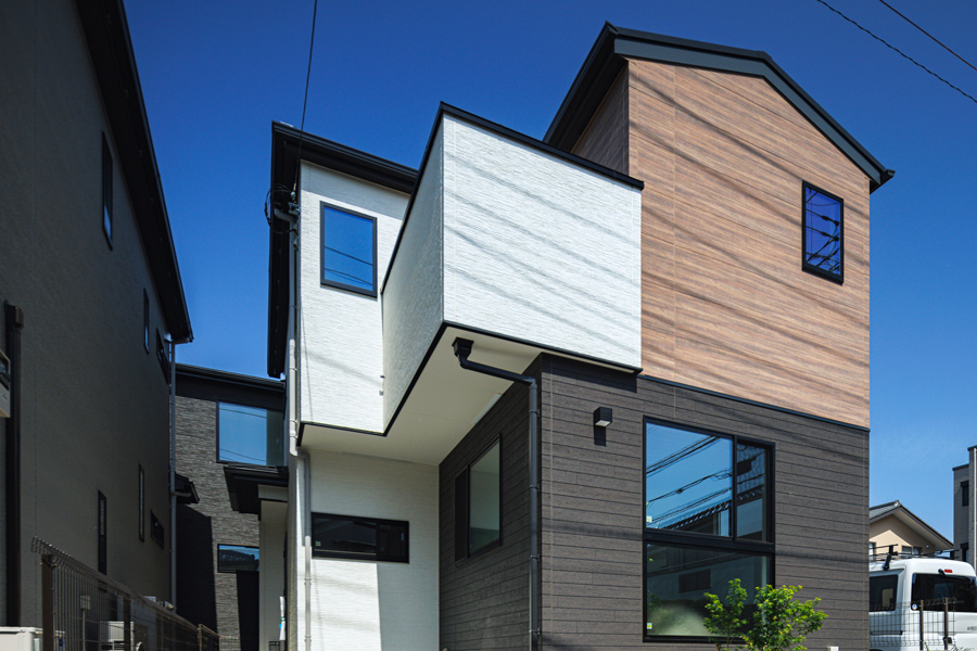 ランダムなフォルムで個性を演出しつつ、自然の風合いを感じる外壁材で纏めることで、やわらかな統一感を創出。人々の目を惹く、存在感ある街並みを描きました。