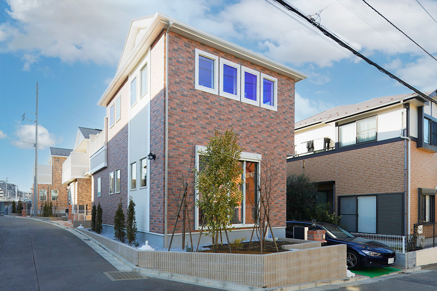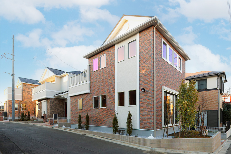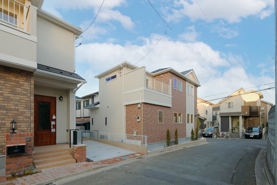 気高さ漂うレンガ調のアクセントと洗練された白の外壁がコントラストを描く3邸。黒い屋根の凛としたシルエットが外観を引き締めながら、街並み全体の格調を高めています。