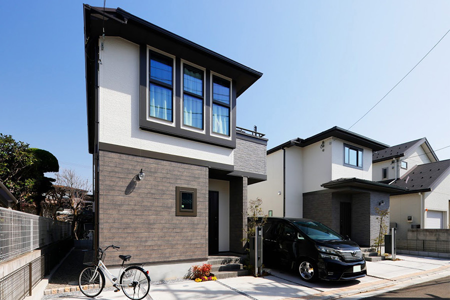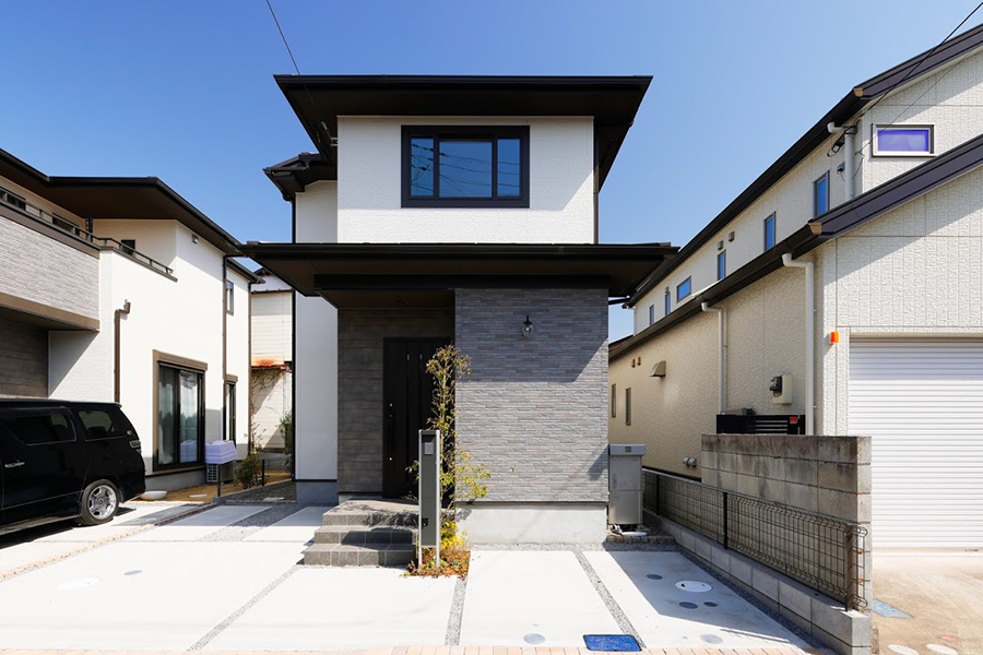 美しい木目調と石目調の外壁を基調に、印象的な庇やサッシが落ち着きと重厚感のある住まいを描きます。
