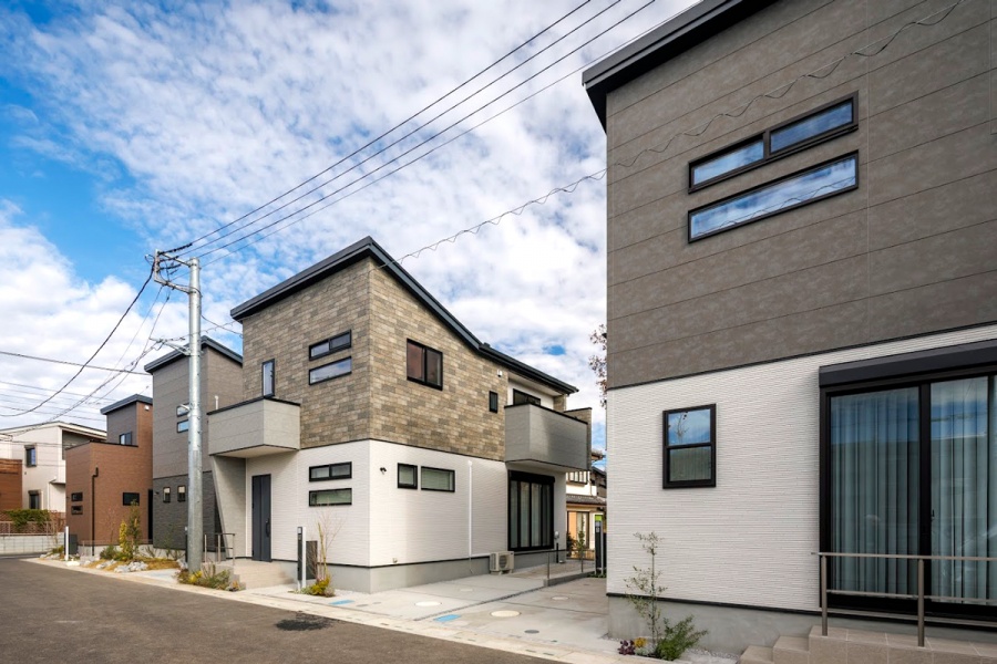 味わいと洗練を感じさせる石目調の外壁材を深い色合いでまとめた街並み。