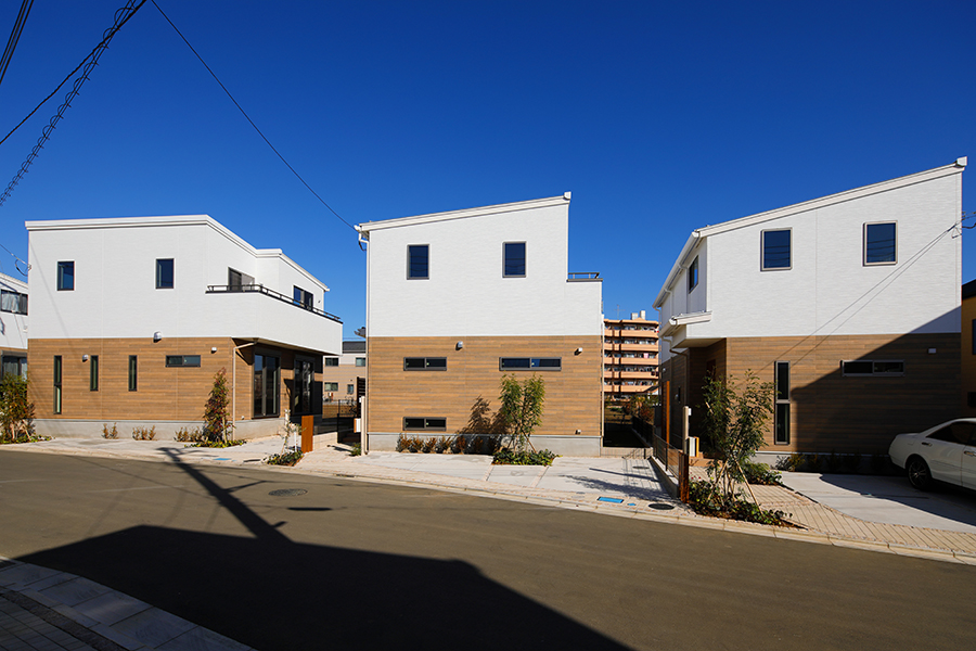 ゆるやかな曲線の先に見え隠れするツートンカラーの“木箱”の街「カフェマチ鶴瀬 ココチ箱」。 森の小道を思わせる道路。その先に見えるのは、まぶしい白と木のやさしい色合いで彩られた街並みです。 ゆったりとカーブを描く街路に沿って並ぶ住まいは、まるで“かわいい木箱”のよう。 一邸ごとにゆとりある空間は、そこに暮らす方々のライフスタイルを感じさせます。