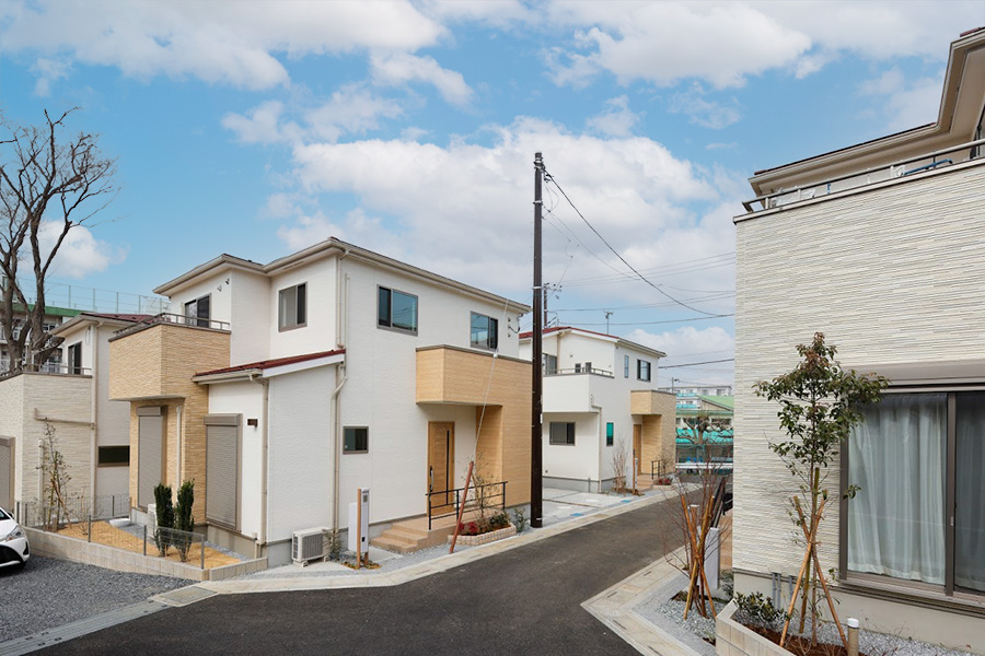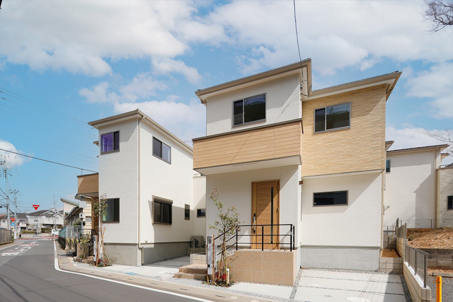 清潔感のある白のメインカラーに木目調の外壁材が温もりあるアクセントを添える外観。リズミカルに配された窓がファサードに変化のある表情を描き、植栽の緑が爽やかに彩っています。