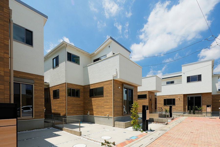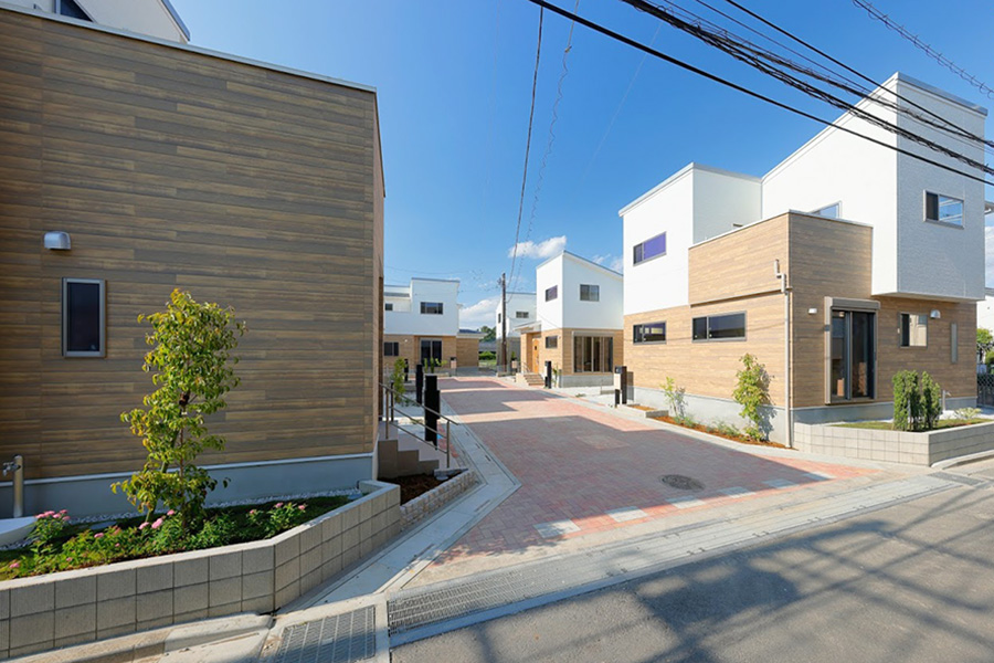 ホワイトと木目のツートンが目を惹く外観デザイン。統一感ある街の中央には、インターロッキングを敷き詰めた街区内道路を設置。街と周辺エリアとを自然に分けつつ、住民のコモンスペースとして豊かな交流を楽しめる街並みを創出しました。