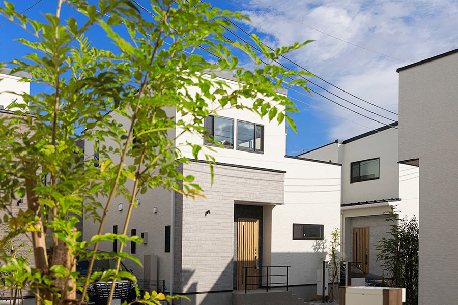 ホワイトを基調とし、シンプルで直線的なフォルムで描いたスクエア型の邸宅。アクセントには、相対するかのように重厚感ある素材を採用し、洗練とモダンを醸し出す街並みを創りあげました。