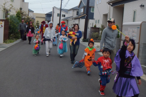 お菓子をもらいに分譲地内を列になって歩く子どもたち。一軒ずつを鳴らしながら全員で回りました。「トリックorトリート!」入れ物が小さく、お菓子が入りきらないほどでみんな笑顔いっぱいでした。全部回り終わったら景品交換、その後子供達は準備していた魚釣りのゲームをやりました。