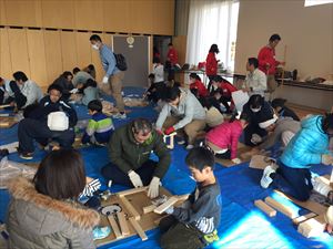 完成後に「さっそく座ってみたら?」と声をかけると「待って!ちゃんとヤスリかけてから」と丁寧に仕上げるお子さんも。みんな初めて作った作品がすっかりお気に入りの様子でした。