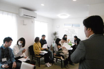 今回は、9組のお客様にお集まりいただきご入居後の説明をさせていただきました。後半は4グループにわかれて他己紹介タイム。ご家族の構成や、趣味の話、地域情報などなど、たくさんの情報交換をされていました。
