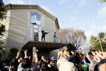 清祓いと餅まきの儀式には多くの大人・子どもたちが集まり、建物に礼をし、撒かれるお餅やお菓子に手を伸ばしていました。
