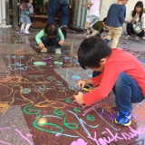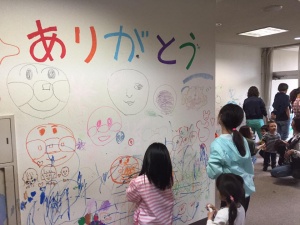 子どもたちが壁に自由にお絵かきできる「落書きイベント」では、建物内を飛び出して玄関アプローチまで思い思いの絵が描かれていました。また、グラウンドでは、竹を使ったペンたて作りに奮闘する子ども達、おいしいコーヒーや手作りパンのサンドウィッチなどケータリングに舌鼓。
