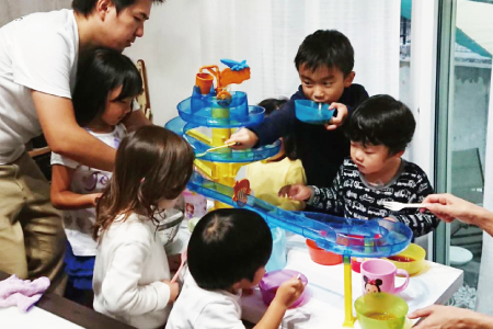 パパ達はテントの下でバーベキュー。外で焼いたお肉や野菜を、ママ・子ども達に渡し、家の中で調理した焼きそばや揚げ物をパパ達に。ママと子供達は室内でのパーティーをそれぞれみんな楽しみました。