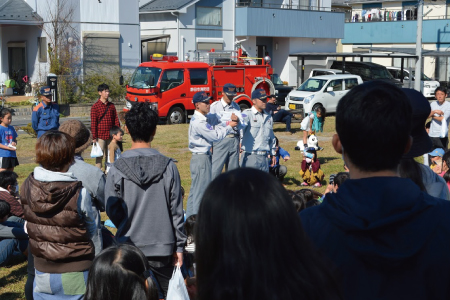 応急処置訓練では、参加世帯に三角巾を配布し消防署の実演で三角巾を使用した応急処置方法を習得、身近な物を使うので大人にも好評でした。