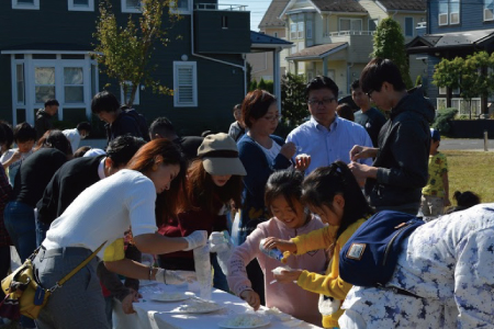 当日は244世帯が参加。まず、町内清掃を行った後に分譲地内の公園に集合。消防署の協力のもと、初期消火や応急処置訓練、炊き出し訓練防災訓練を実施しました。