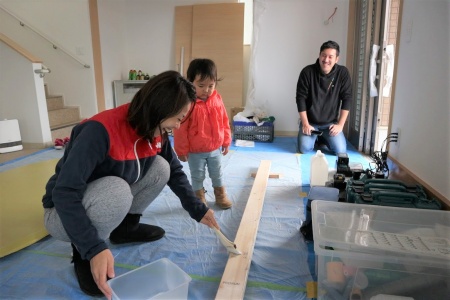 参加したのは分譲地に住むご家族とその周辺の地域住民の方々、担当営業マンも併せて総勢80名ほど!テーブル制作、椅子塗装、カーペット張りなど、それぞれチームに分かれて講師主導のもと作業が進んでいきます。参加者の中には過去に野田市で開催したDIYワークショップに参加したOB親子も!