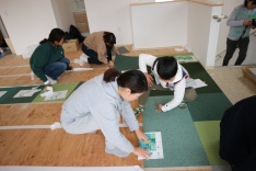 タイルカーペットをみんなでペタペタ。