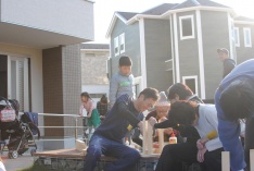参加したのは分譲地に住むご家族とその周辺の地域住民の方々、担当営業マンも併せて総勢80名ほど!テーブル制作、椅子塗装、カーペット張りなど、それぞれチームに分かれて講師主導のもと作業が進んでいきます。参加者の中には過去に野田市で開催したDIYワークショップに参加したOB親子も!