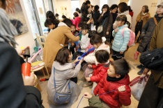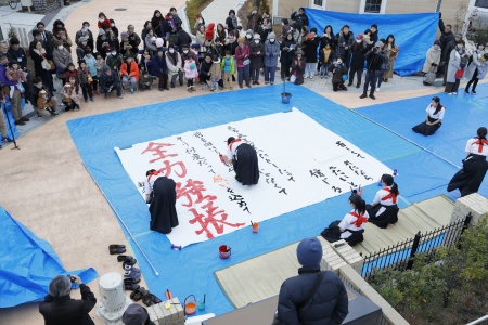 来賓として越谷市長 高橋様にもご出席・ご挨拶をいただいたオープニングセレモニーの後には、文教大学和太鼓サークル「出津龍」演奏と、越谷西高校書道部コラボによるパフォーマンス。大迫力の太鼓とダイナミックな書道部の実演に会場の人々は釘づけ!自然と手拍子が起こり、寒さを忘れて盛り上がりました。