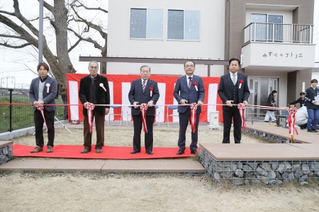 今回、主催である南荻島まちづくりサポーターと自治会に加え、越谷市、文教大学、越谷西高校との産官学コラボが実現、地域のマルシェも加わって、当日は来場者とあわせて約300名が集まりました。分譲地のご入居者も何組も参加され、みんなで完成をお祝いしました。