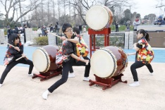 来賓として越谷市長 高橋様にもご出席・ご挨拶をいただいたオープニングセレモニーの後には、文教大学和太鼓サークル「出津龍」演奏と、越谷西高校書道部コラボによるパフォーマンス。大迫力の太鼓とダイナミックな書道部の実演に会場の人々は釘づけ!自然と手拍子が起こり、寒さを忘れて盛り上がりました。