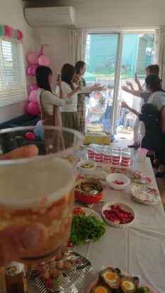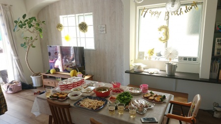 当日は、定例となっているママさんお手製料理の持ち寄り。誕生日を迎えた家庭の御主人が乾杯の音頭を行い誕生日会&分譲地入居3年目記念パーティースタートです。