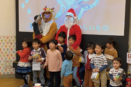 続いてサプライズでサンタさん登場&お菓子プレゼント♪サンタさん&トナカイコスチュームを纏ったパパ2人がサプライズ登場!子どたちは大はしゃぎ!