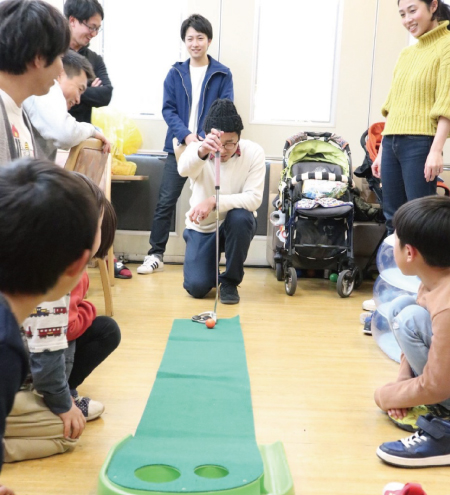 最後は家族対抗 パターゴルフ対決!競争要素の高いゲームを何かしようということになり、事前の打ち合わせで出たアイデアの中から決まりました。事前想定よりも意外に盛り上がり、プレーオフまで発展し注目が集まる白熱した家族対決になりました!
