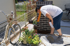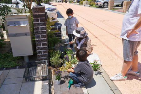 いよいよ、各ご家庭の玄関前に出て植え込みに挑戦です。みなさん楽しそうにそれぞれのレイアウトを決め、草花を植えていきました。