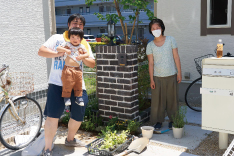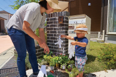 いよいよ、各ご家庭の玄関前に出て植え込みに挑戦です。みなさん楽しそうにそれぞれのレイアウトを決め、草花を植えていきました。